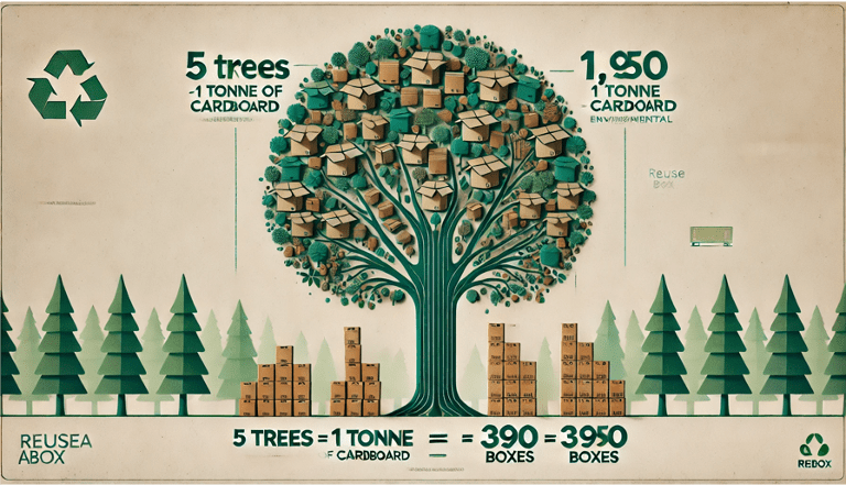 It takes approximately 5 trees to produce 1 tonne of cardboard, which results in around 1,950 average-sized packing boxes. This means that each tree is used to create just 390 boxes, based on data from the Reuseabox Environmental Tool.